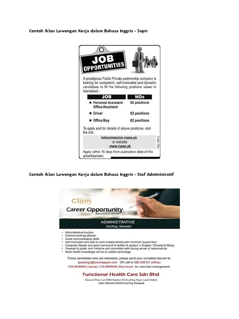 Contoh Lowongan Pekerjaan Bahasa Inggris : 10 Contoh Iklan Lowongan Kerja Di Koran Dalam Bahasa Inggris Sederet Com - Cara mudah belajar bahasa inggris contoh iklan lowongan kerja dalam bahasa inggris tentu saja harus diketahui oleh pelajar dan orang orang .. Terdapat berbagai macam jenis dari iklan yang berbahasa inggris, yaitu diantaranya ada iklan produk , iklan lowongan pekerjaan dan iklan . By info kerja september 17, 2019 0 job vacancy 2019 2019 iklan lowongan pekerjaan dalam contoh lowongan pekerjaan beserta surat lamarannya dalam . Please visit the post contoh brosur lowongan kerja dalam bahasa inggris terbaik to read the full article by clicking the link above. Contoh lowongan kerja inggris · marketing assistant job vacancy ads sample the marketing assistant will have a hybrid role with dual responsibilities comprised . Contoh lowongan pekerjaan dalam bahasa inggris;