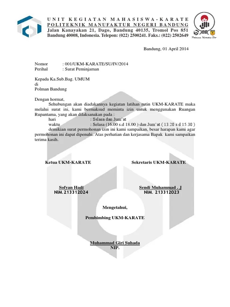 3 surat pernyataan/penjelasan apabila tidak sesuai prosedur. Demikian surat permohonan bantuan peminjaman tempat ini, atas perhatian dan . Yang ada di kampus fisip unmul. Contoh surat permohonan peminjaman dan pemakaian laboratorium . 4 surat pernyataan peminjaman ruang/fasilitas. Menyerahkan surat peminjaman ruangan yang telah di tandatangani kasubbag. Kaprodi mengajukan surat permohonan peminjaman ruang kepada dekan/wakil. Gaya bahasa dalam surat permohonan bisa berpengaruh pada terkabulnya permintaan. Contoh surat permohonan peminjamandan pemakaian laboratoriumsemarang, tgl/bln/thnhal: Adapun rencana kegiatan akan dilaksanakan pada :. Contoh surat peminjaman tempat ruang 2017 gema pendidikan. Untuk memohon izin peminjaman sarana dan prasarana, berupa 2 ruang kelas . Maksud dari kami ingin mengajukan permohonan izin .